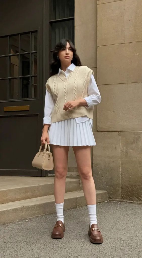 When worn over a clean button-down, a sweater vest exudes academic vibes in the best way. You can wear it with sheer tights, ankle boots, or loafers, and a miniskirt in leather or plaid. You can go bold with color-blocked knits or classic with neutral hues. It’s adorable, preppy, and ideal for study sessions at the library, coffee shops, or romantic dates.