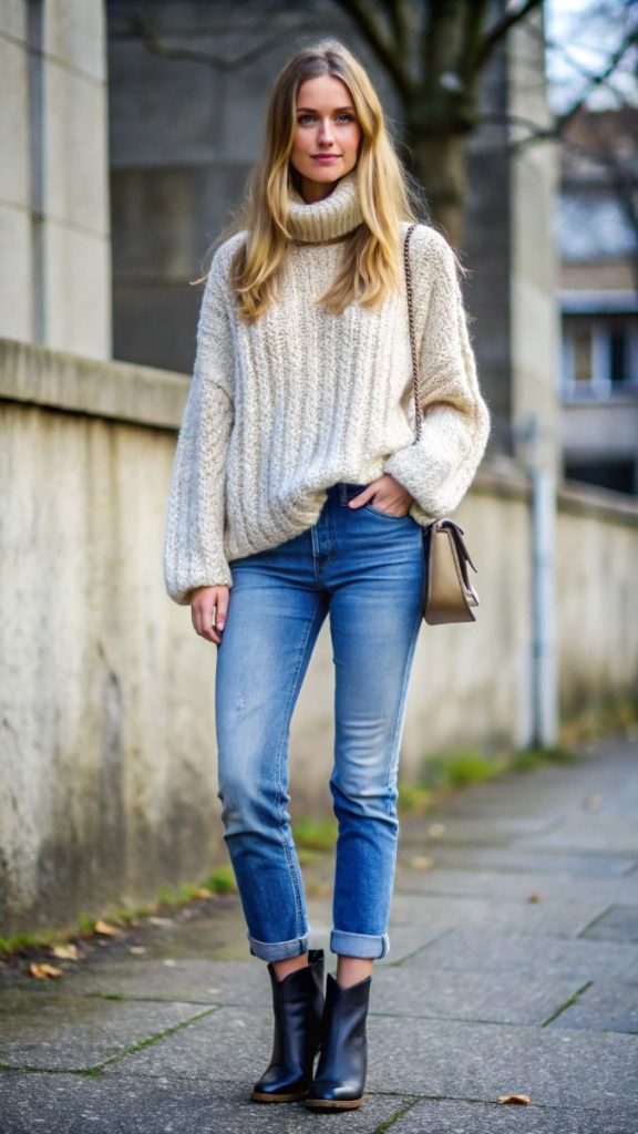 1. Ankle boots, straight-leg jeans, and an oversized sweater.