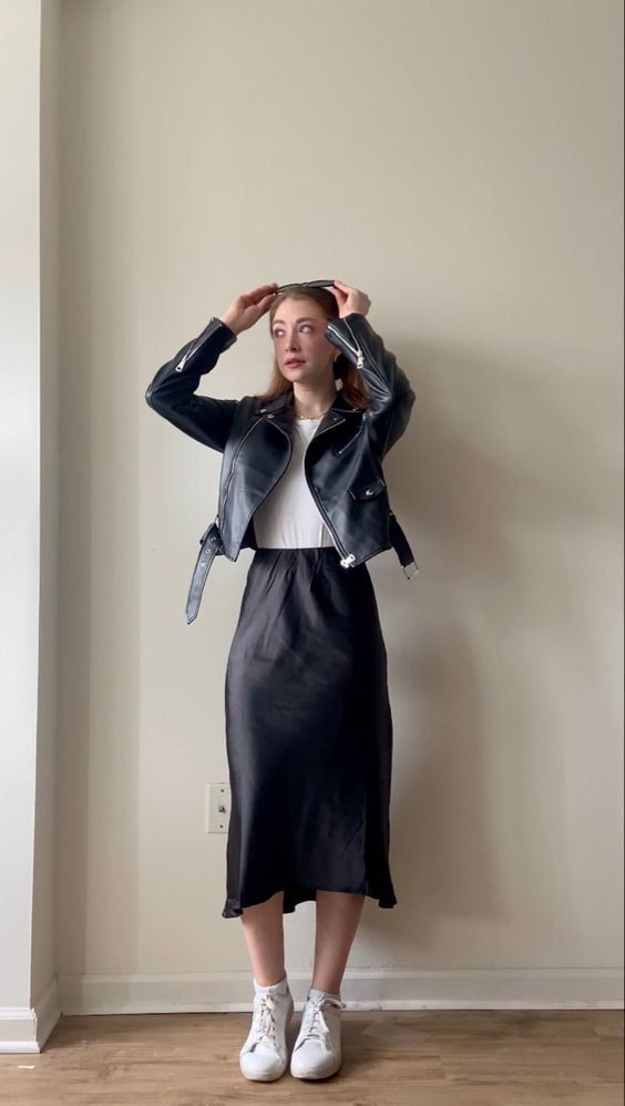 Wearing a black leather jacket over a satin or pleated midi skirt will help you embrace the cool-girl vibes of fall. You can complete the look with stylish ankle boots, sneakers or loafers and a form-fitting mock-neck top underneath. It is feminine, edgy, and suitable for both day and nighttime. A striking red lip or a small piece of gold jewellery elevates this ensemble.