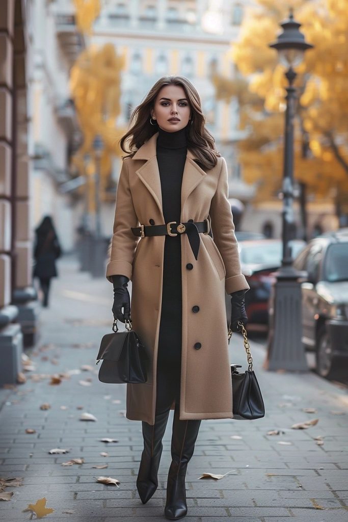 Any fall ensemble is immediately enhanced by a fitted long wool coat in camel, charcoal, or navy. You can put it on with slim jeans or pants and a fitted turtleneck. An elegant and timeless city look can be achieved by adding sleek ankle boots or knee-high boots. To finish the look, add oversized sunglasses and a leather purse. For meetings, dinner dates, or shopping excursions where you want to look elegant but stay warm, this ensemble is ideal.
