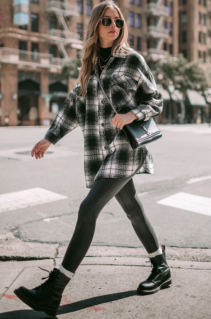 The shirt-jacket, or shacket, is a fall wardrobe staple. Choose an oversized plaid style and wear it over a turtleneck or fitted top. For the ideal balance of casual and edgy, pair with chunky combat boots and black leggings. You can look fall-ready by putting your hair in a messy bun and accessorising it with gold hoops. This one is essential for strolls, informal brunches, or even outings to pick apples.