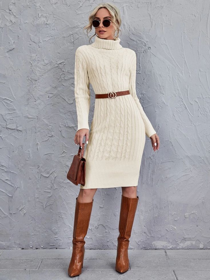 3. Belted Coat + Knee-High Boots + Turtleneck Dress.