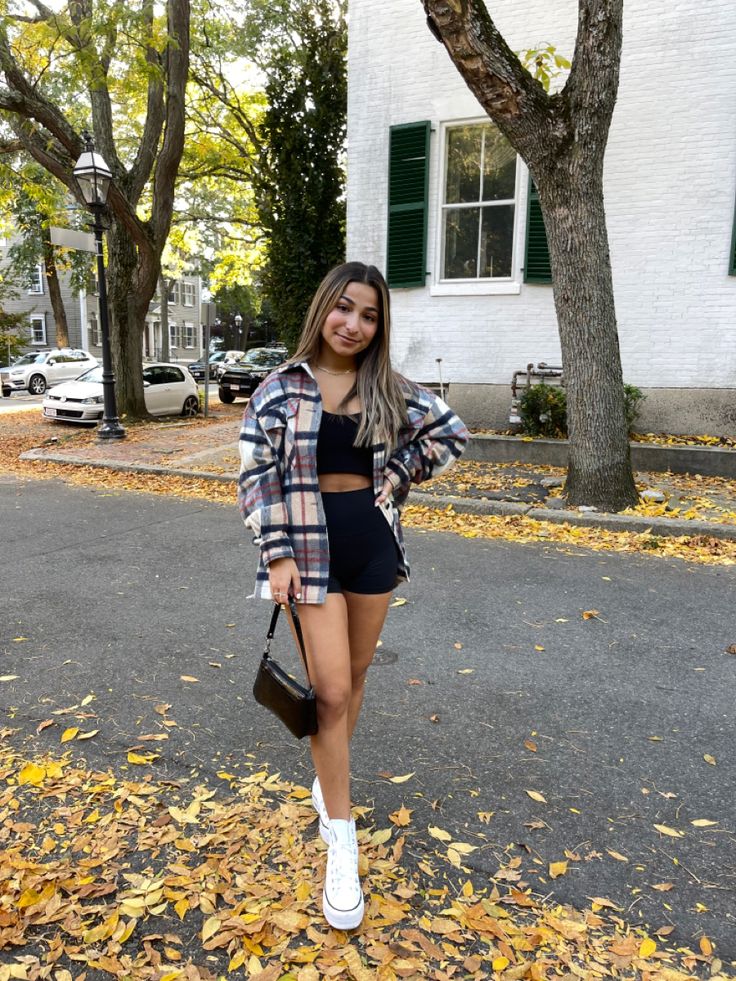 Is that late-fall warmth still present? For days in between, an open, oversized flannel shirt looks great with a crop top and biker shorts. It’s cool on the bottom, cosy on top, and complete with white crew socks and sneakers. It’s ideal for taking selfies at the pumpkin patch or simply strolling to the farmer’s market. It’s easy to use, comfortable, and still looks good along with every season.