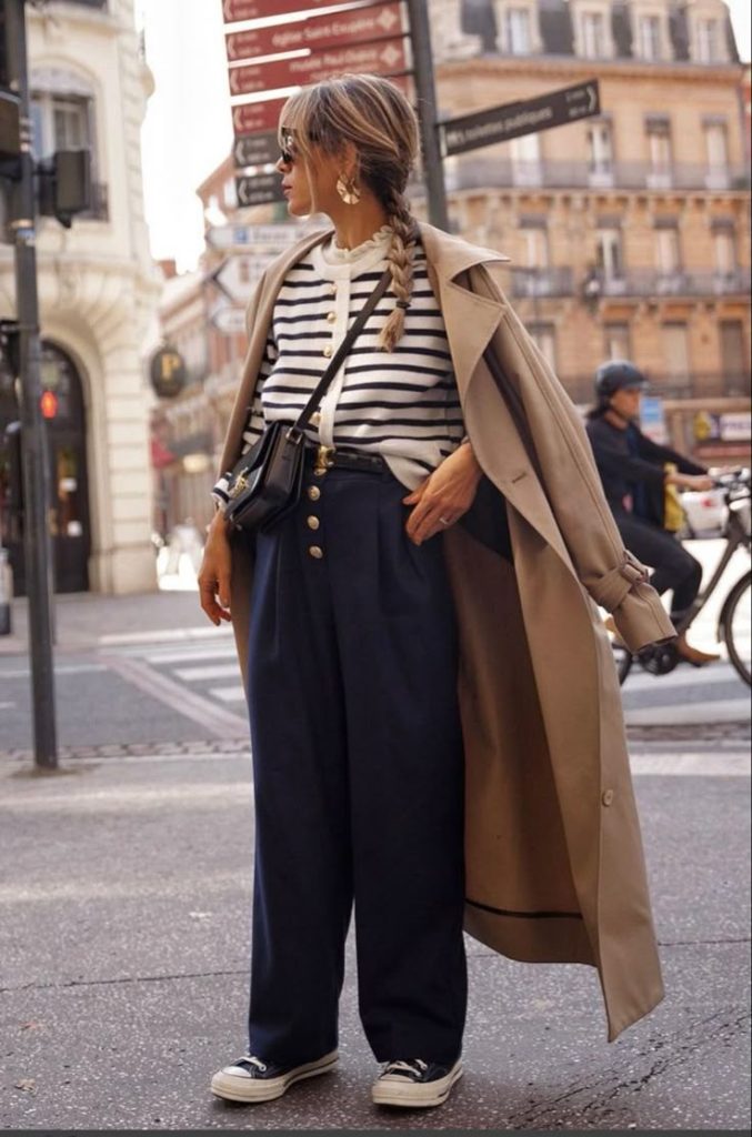 A classic trench coat is the epitome of timeless fall fashion. You can wear it with straight-leg jeans or slim-fitting pants and over a striped long-sleeve t-shirt. For a polished, Parisian vibe, pair your cross-body satchel with sleek ankle boots or loafers. Clean, simple, and effortlessly stylish, this look is perfect for office commutes, coffee dates, and city walks. Moreover, on chilly days, it’s a simple go-to because it layers nicely without feeling heavy.