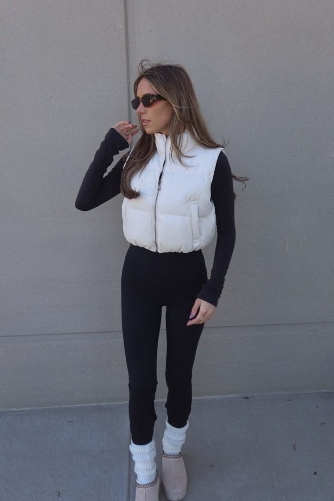 When it’s cold in the morning and warm by midday in the early fall, puffer vests are the best accessory. You can top a thermal long-sleeve or Henley top with a vest in a neutral or earthy hue, and wear it with yoga pants or flared leggings. For a laid-back, athletic fall style, pair them with vintage sneakers and a scrunchie or claw clip. It feels modern and stylish, yet comfortable enough for a stroll in the park or a grocery run.